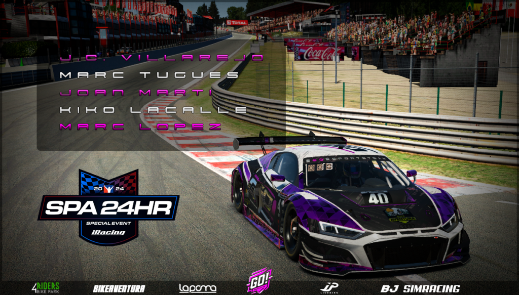 Para tener claras nuestras opciones, y con la fecha tan complicada del evento, sacamos un único coche, el Audi R8 LMS GT3 EVO; con nuestros pilotos José Carlos Villarejo, Marc Tugues, Marc López, Joan Martí y Kiko Lacalle.